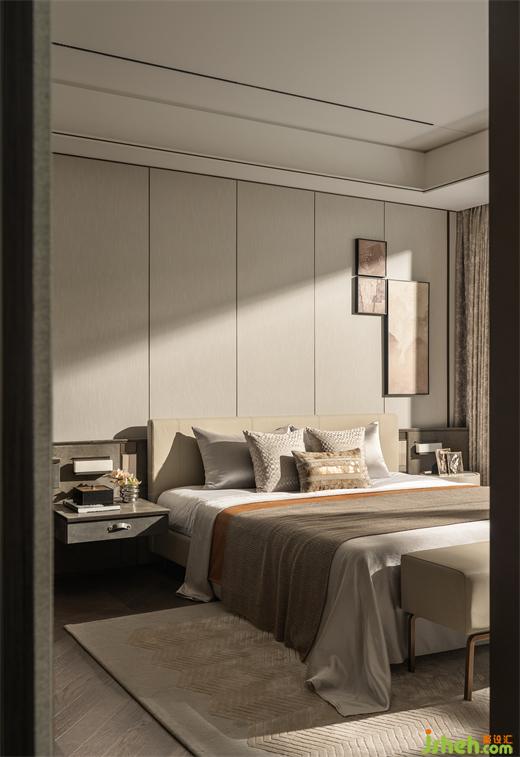 主臥衣帽間、單獨(dú)衛(wèi)生間以及梳妝臺(tái)的設(shè)置,樣板房設(shè)計(jì)滿足了實(shí)際的功能需求。品質(zhì)感家居產(chǎn)品和床頭柜細(xì)節(jié)營造,為主人提供了舒適的睡眠環(huán)境。