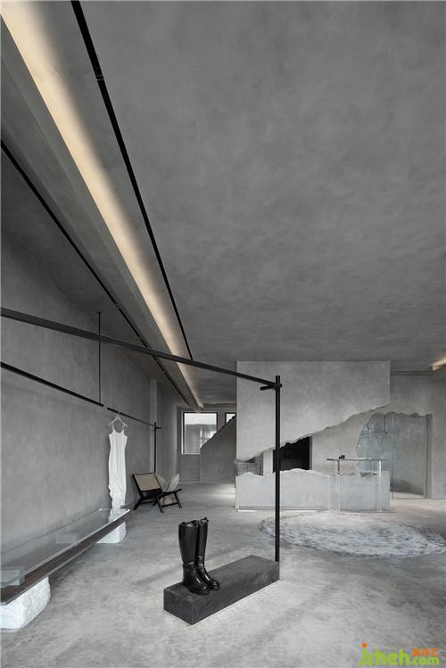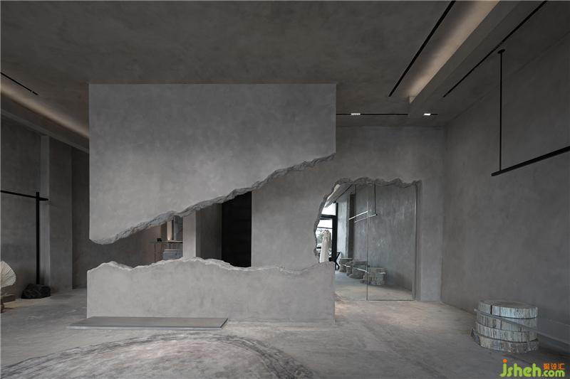 店鋪裝修設(shè)計設(shè)計師對空間的靈感來源是受到美國當代藝術(shù)家Daniel Arsham的未來考古風(fēng)影響,在設(shè)計上保留原建筑效果,打造出開裂的墻壁,它在空間中表達出考古空間的同時,將一道道墻壁視作為阻擋,斑駁的墻體被一種牽引力肆意地撕扯,當連接著天花板和地板之間的墻壁裂開,泥石崩塌,另一個不同世界將慢慢呈現(xiàn)出來,仿佛這是一個開裂的廢墟世界,也是空間與空間之間的交接間點。