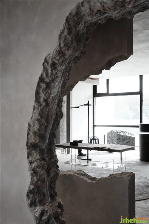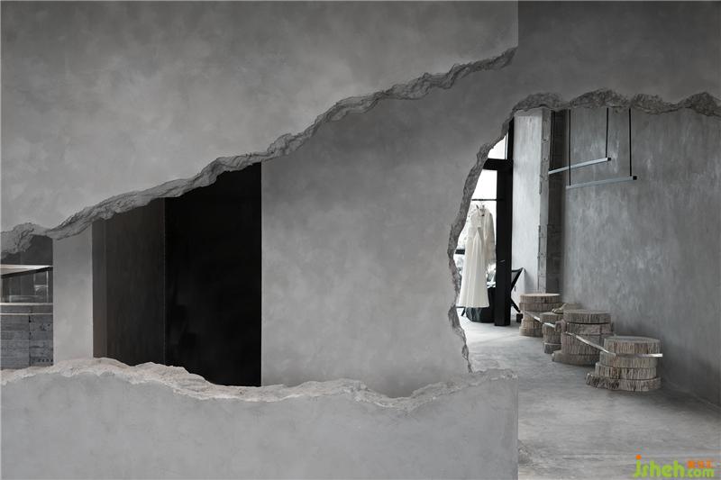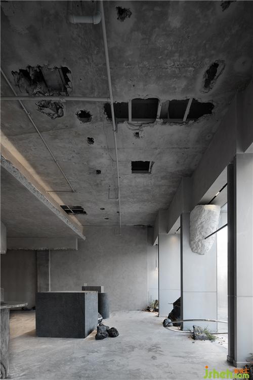 The whole space is " Out of Place " with the surrounding environment. They are like ruins, but they are so different. It is spiritually independent, firm and silent. The walls of mottled texture split symmetrically from top to bottom. Although they are separated, they form a corresponding relationship. People can peep at everything in the cracks, as if they can see the future world from the cracks . At the same time, it is also in response to the design to show the owners and corresponding consumer groups, they all have a unique aesthetic, unique vision, and a different point of view of the world.