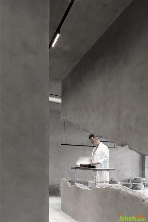 整個(gè)空間與周圍的環(huán)境“格格不入”,它們像廢墟一樣,但卻又如此與眾不同。它在精神上自我獨(dú)立,堅(jiān)定沉默。斑駁質(zhì)感的墻壁上下對(duì)稱裂開,兩者雖相隔卻成呼應(yīng)關(guān)系。人們可以在夾縫中窺探一切事物,仿佛能從夾縫中看到未來的世界。同時(shí)也是呼應(yīng)設(shè)計(jì)上想要呈現(xiàn)出業(yè)主和對(duì)應(yīng)的消費(fèi)群體,他們都有著獨(dú)特的審美、獨(dú)特的眼光,以及不一樣的角度來看世界。
