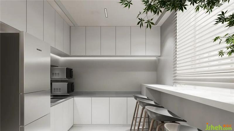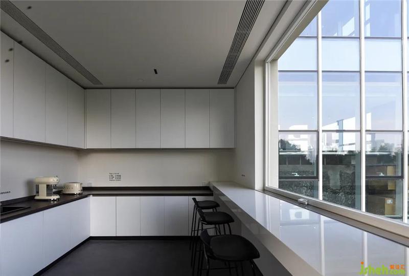 DPD辦公總部地理位置的優(yōu)勢,將廣州珠江邊的景色盡收眼底,整個空間中視野風景最好的位置是茶水間區(qū)域。設計師早期希望把它規(guī)劃成BOSS房和大會議室,但在由于該區(qū)域有排污系統(tǒng),風水學上不適宜作為公司重要區(qū)域,最終調整成茶水間,采用大面積的玻璃窗加強光線通透,員工可以在休閑放松的時候坐在茶水間,欣賞珠江景色,身心得到放松。