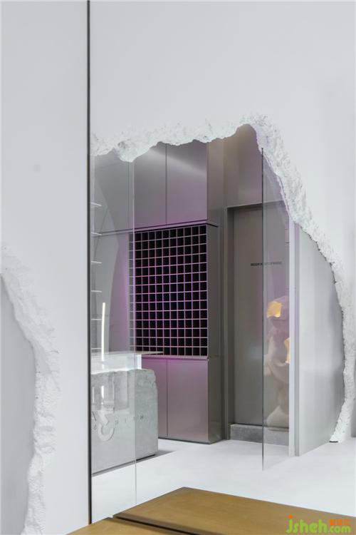 穿過時空長廊,時空維度變成了一個明亮、虛幻且充滿潔凈的空間,充滿未來無限可能性。兩點成一弧,形成教堂元素的夾角,時空維度的邊界墻面,既是設(shè)計靈感的象征之一,又是對破碎墻體的隱喻。