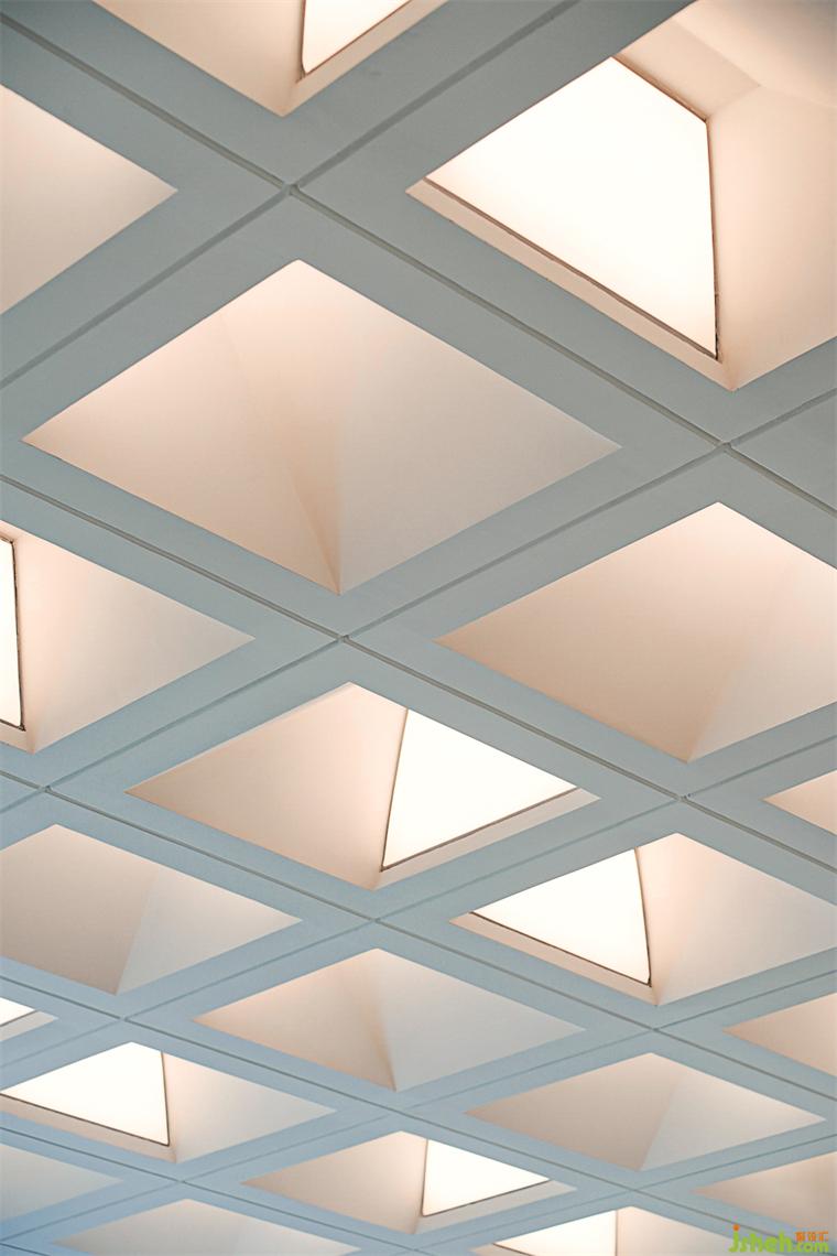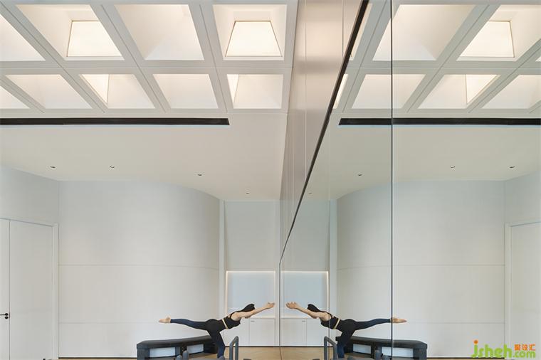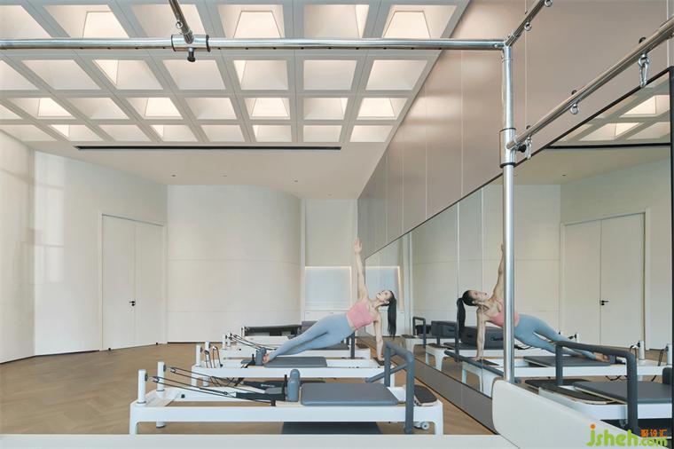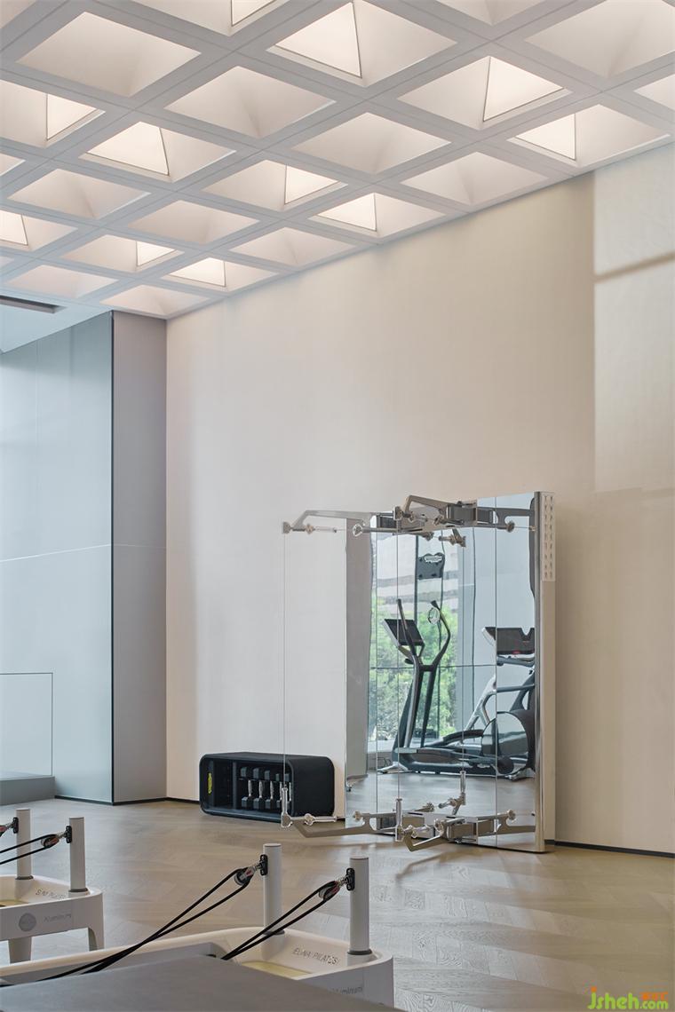 普拉提區(qū)利用格柵天花緩解空間的封閉感,旗艦店設(shè)計(jì)暖白色燈膜營造專屬的純粹氛圍,柔軟又感性。