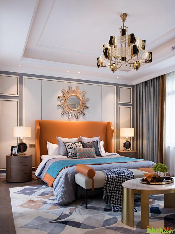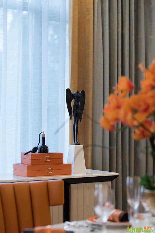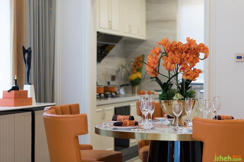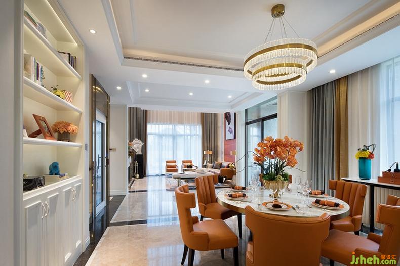 餐廳的在整體色調(diào)和材質(zhì)選擇上,與客廳相互呼應(yīng),橙色的皮革材質(zhì)椅子、香檳金圍起的大理石圓形餐桌以及豪華水晶吊燈,共同組成餐廳的主要場(chǎng)景。