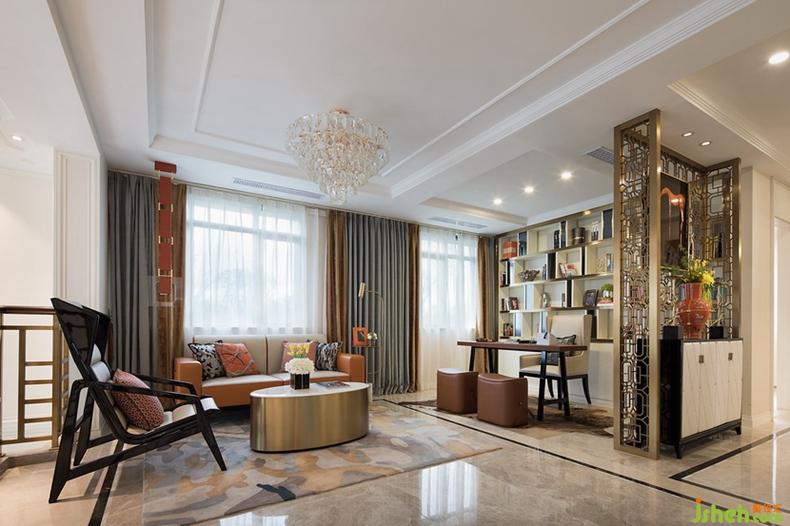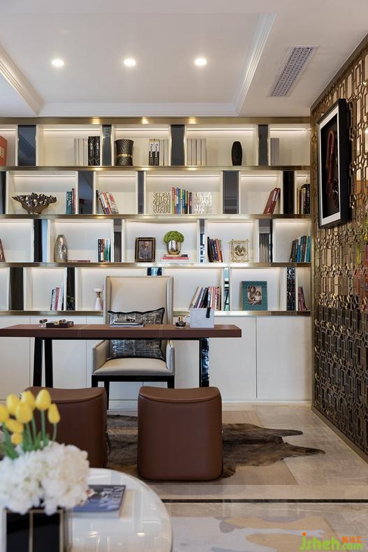 安道爾棕實(shí)木書桌和皮革面料坐凳的組合,凸顯一種時(shí)尚精致的工藝品質(zhì)感,香檳金金屬屏風(fēng)和書架邊框線條,共同勾勒出尊貴高級(jí)的空間層次感。