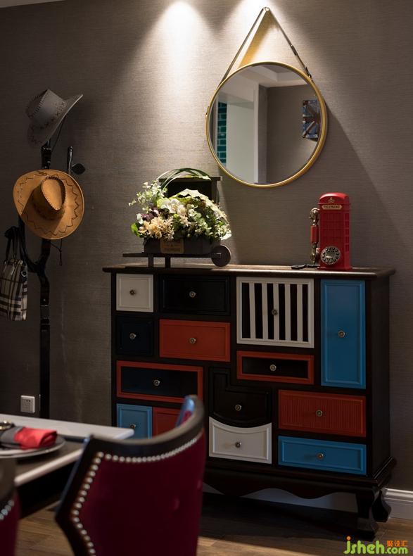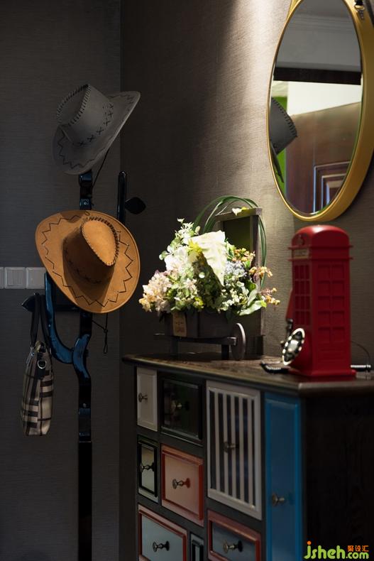 玄關(guān)處黑色衣帽架和收納柜依次擺放,為居室主人的生活帶來便利。