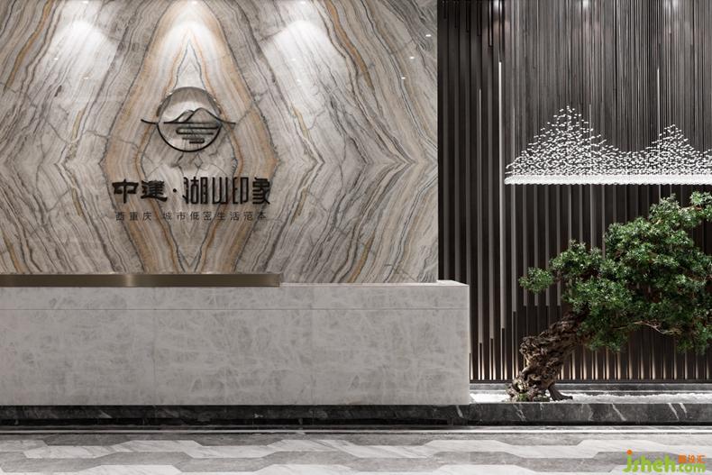 拼紋玉石大理石墻面立于中間,兩邊虛實(shí)結(jié)合的立體式木格柵營造出山城的印象,于不同角度呈現(xiàn)不同的立體效果;右側(cè)以園林白色細(xì)石結(jié)合松屬植物形成獨(dú)特的人文景觀,為前廳增添了盎然綠意和生機(jī)。
