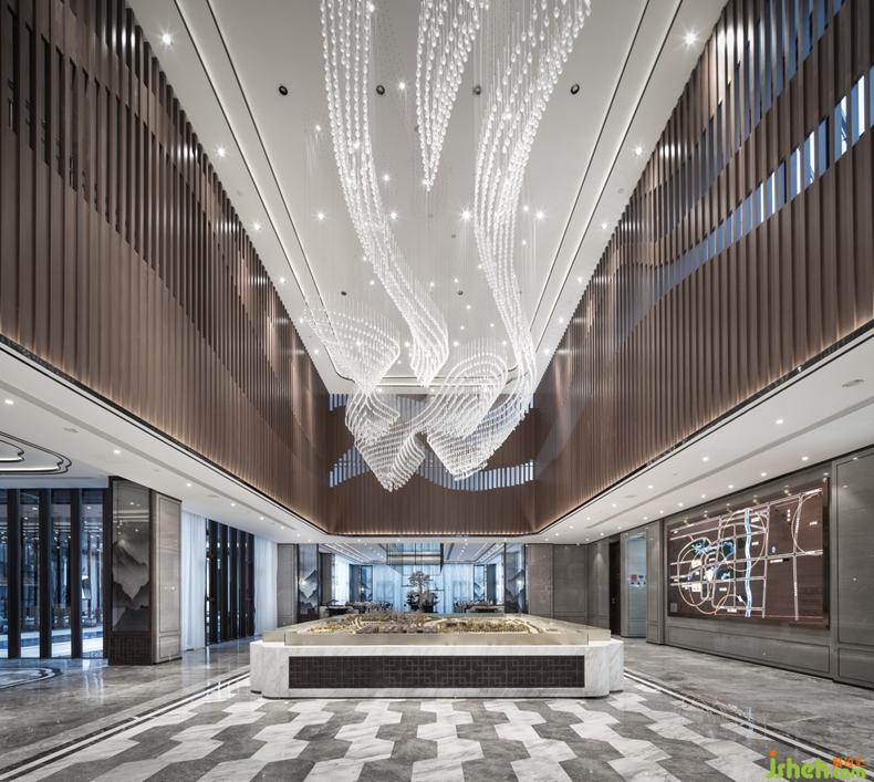 步入前廳,雅致的中式風(fēng)情和靈透的人文氣息融為一體,接待臺(tái)采用拼紋玉石背景墻面,以植物果實(shí)為元素設(shè)計(jì)的吊燈自由懸掛組合,整體空間通透大氣而不乏靈動(dòng)寫意。