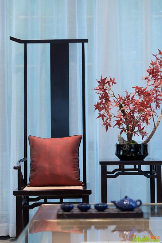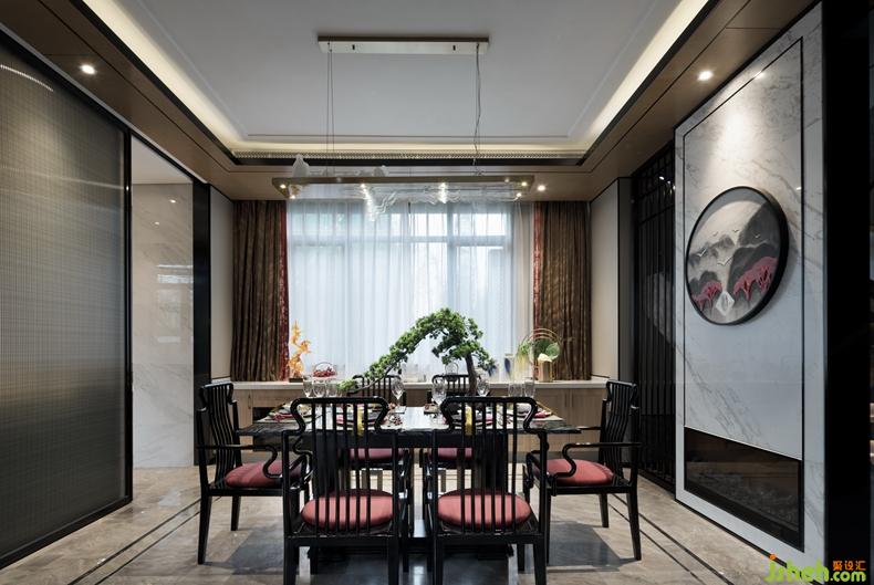 餐廳空間擺設(shè)簡潔的方形大理石餐桌和黑色木質(zhì)座椅,簡練的線條配以紅色坐墊,延續(xù)現(xiàn)代中式意蘊。