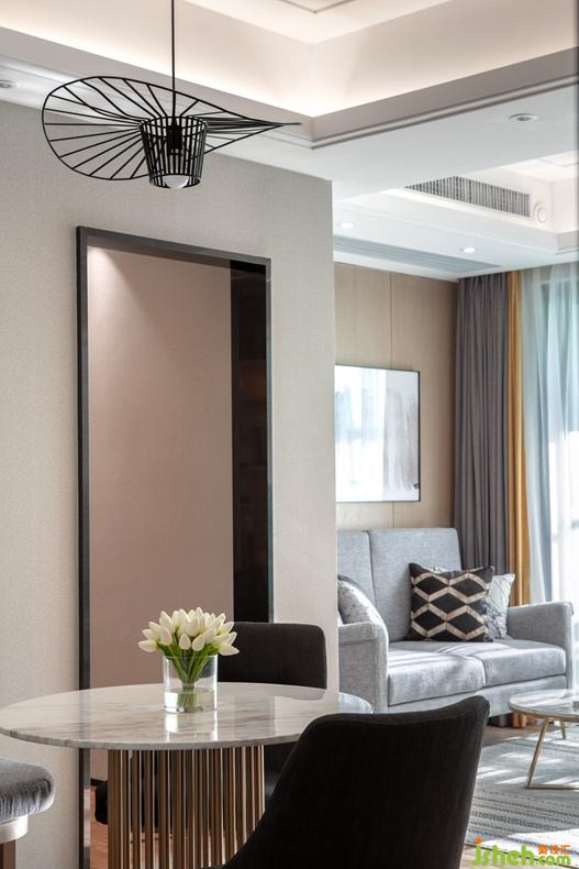 餐桌上方懸掛蒲扇狀藝術(shù)吊燈,和天花四周的方形燈帶共同烘托出一個(gè)溫馨愜意的氣氛。