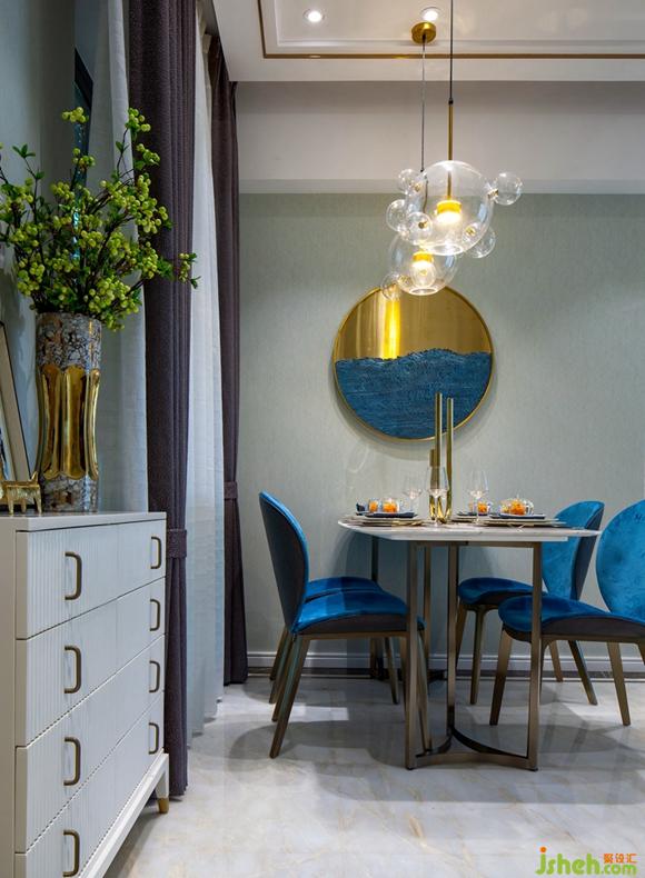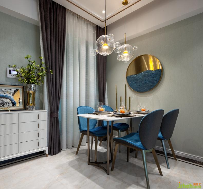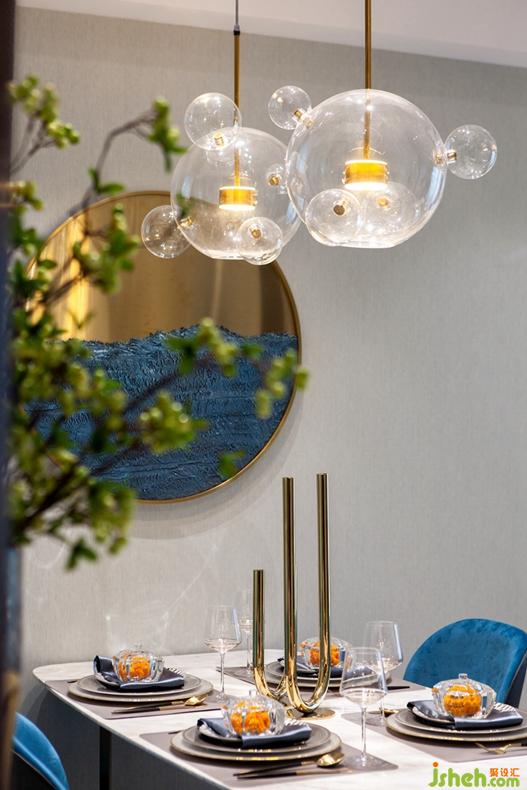 軟裝上圓形透明藝術(shù)吊燈懸掛餐桌之上與背景墻面一幅簡約金屬與海軍藍的圓形裝飾畫元素呼應(yīng),金屬的質(zhì)感,玻璃的靈動性,是整個空間的藝術(shù)氣息躍然眼前,演繹時尚和藝術(shù)的結(jié)合,呈現(xiàn)輕奢品質(zhì)生活。