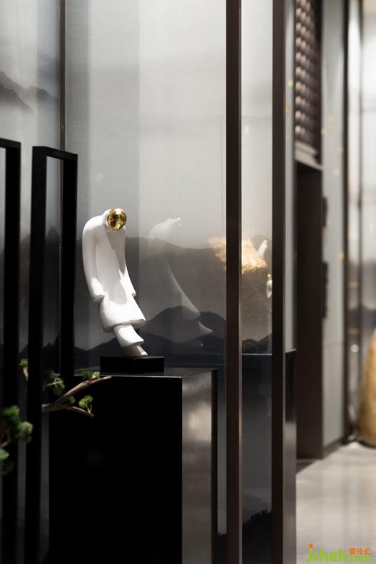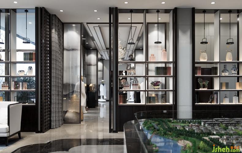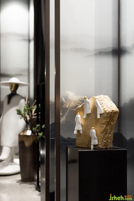 層板陳設(shè)注重疏密程度的錯(cuò)落擺放,通過(guò)古韻造景賦予空間文化底蘊(yùn)感,同時(shí)隔而不斷,打造移步換景的園林式布局。