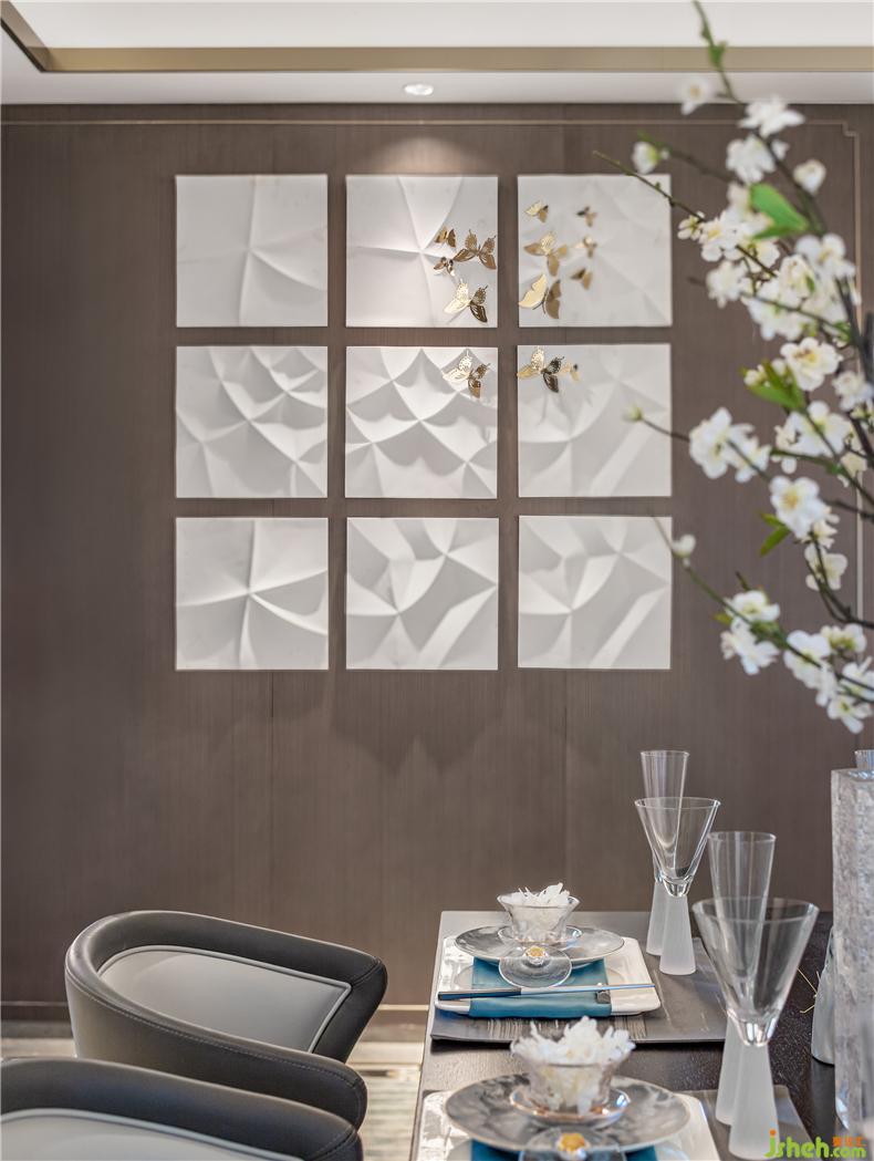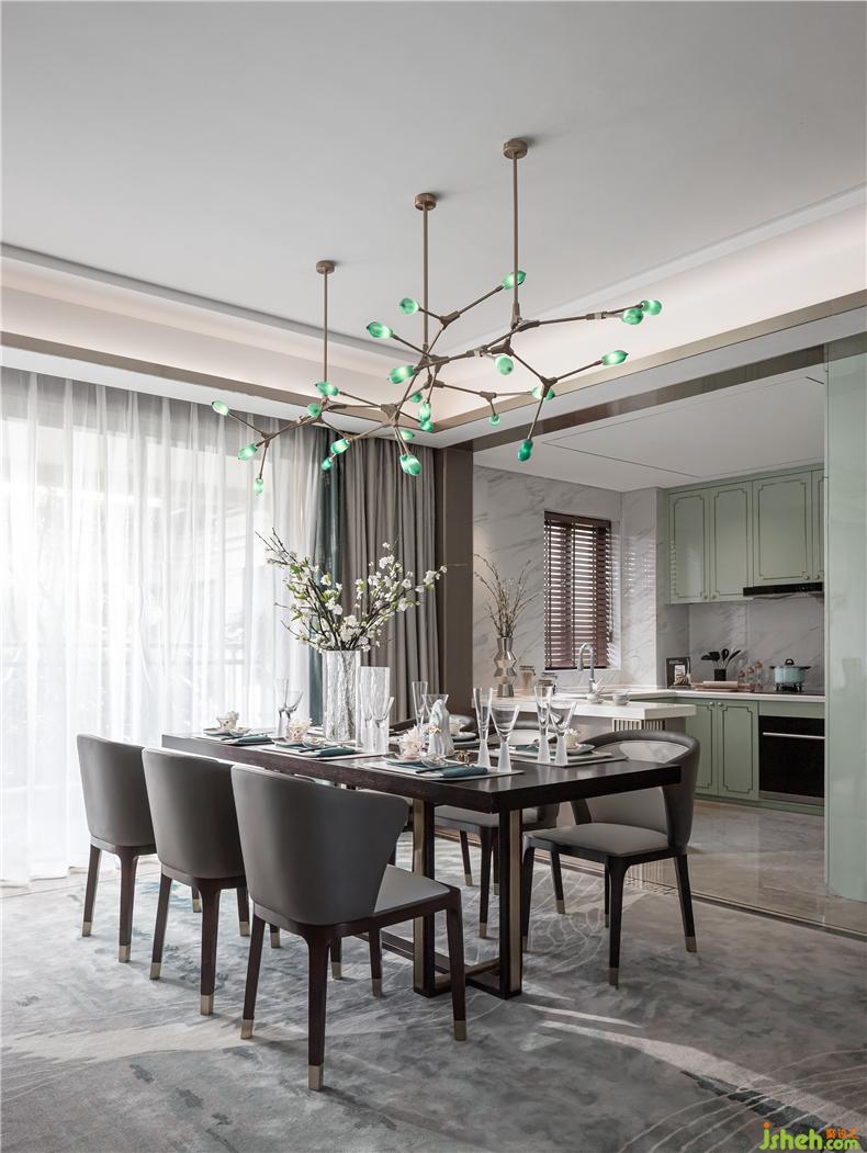 餐廳上方懸掛極具設計感吊燈,用極簡的設計寓意碩果累累,為空間加注靈氣,樣板房設計餐桌椅與空間整體色調(diào)一致,給人沉穩(wěn)尊貴的印象,杯盤交錯間,加以金屬構(gòu)件裝飾,為視覺路徑創(chuàng)造停留點