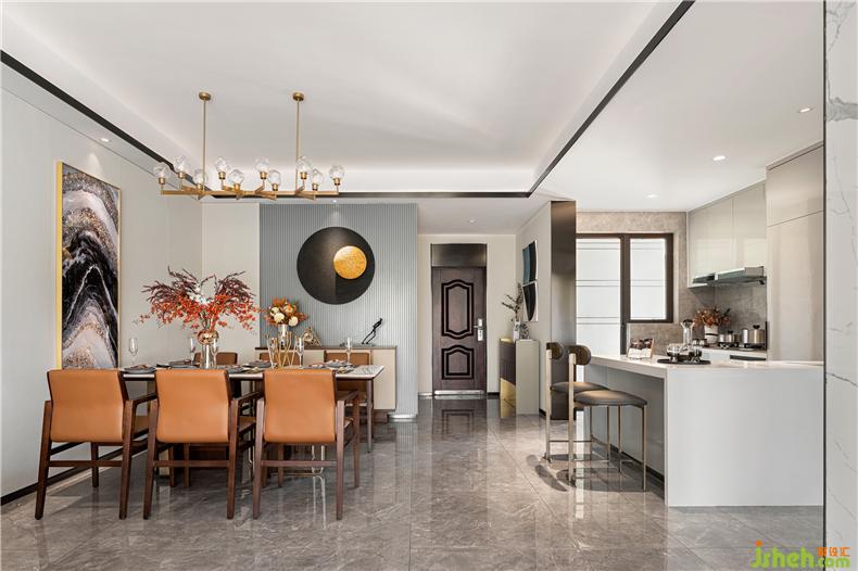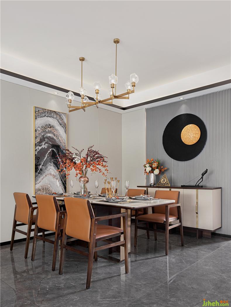 天然大理石臺(tái)面搭配具有裝飾線條感及簡(jiǎn)約、節(jié)省空間的桌腳設(shè)計(jì),樣板房設(shè)計(jì)有助于于餐椅的擺放使用方便性