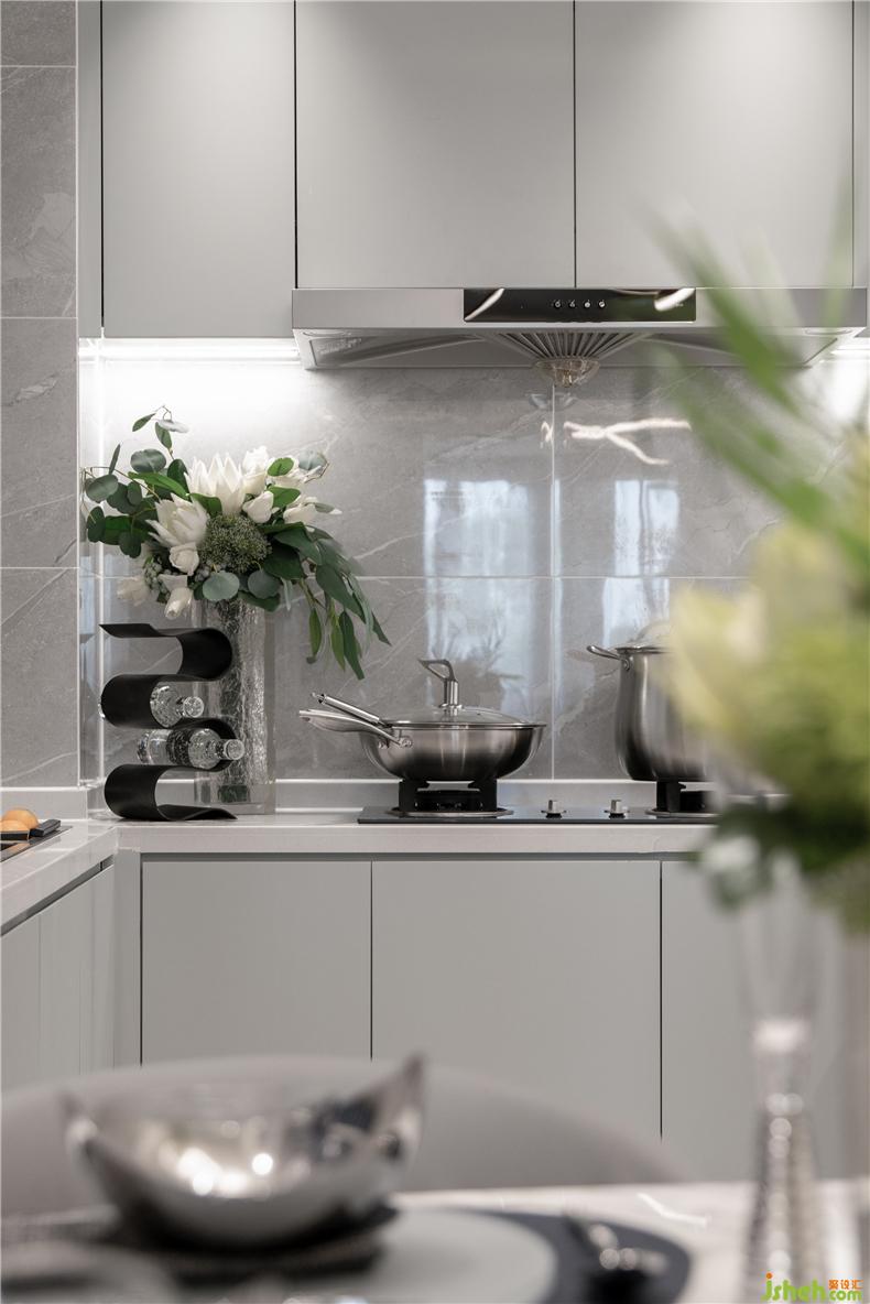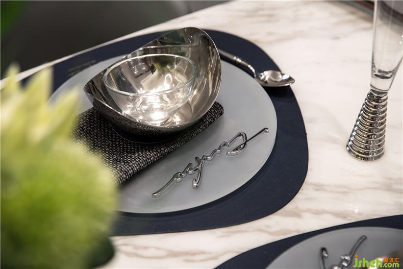 大理石餐桌搭配銀質(zhì)餐具與灰色調(diào)的餐墊,利落而前衛(wèi)。樣板房設(shè)計點綴在桌上的花藝,向陽生長,順著光的明亮,灑向桌面,將斑駁的花影星星點點揮落在桌上