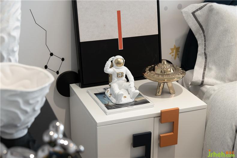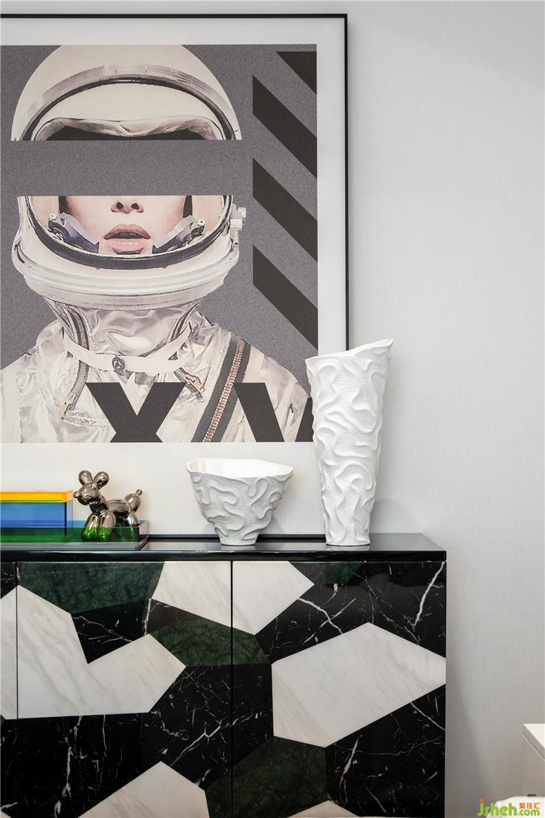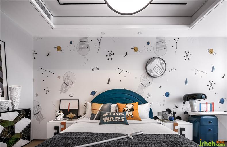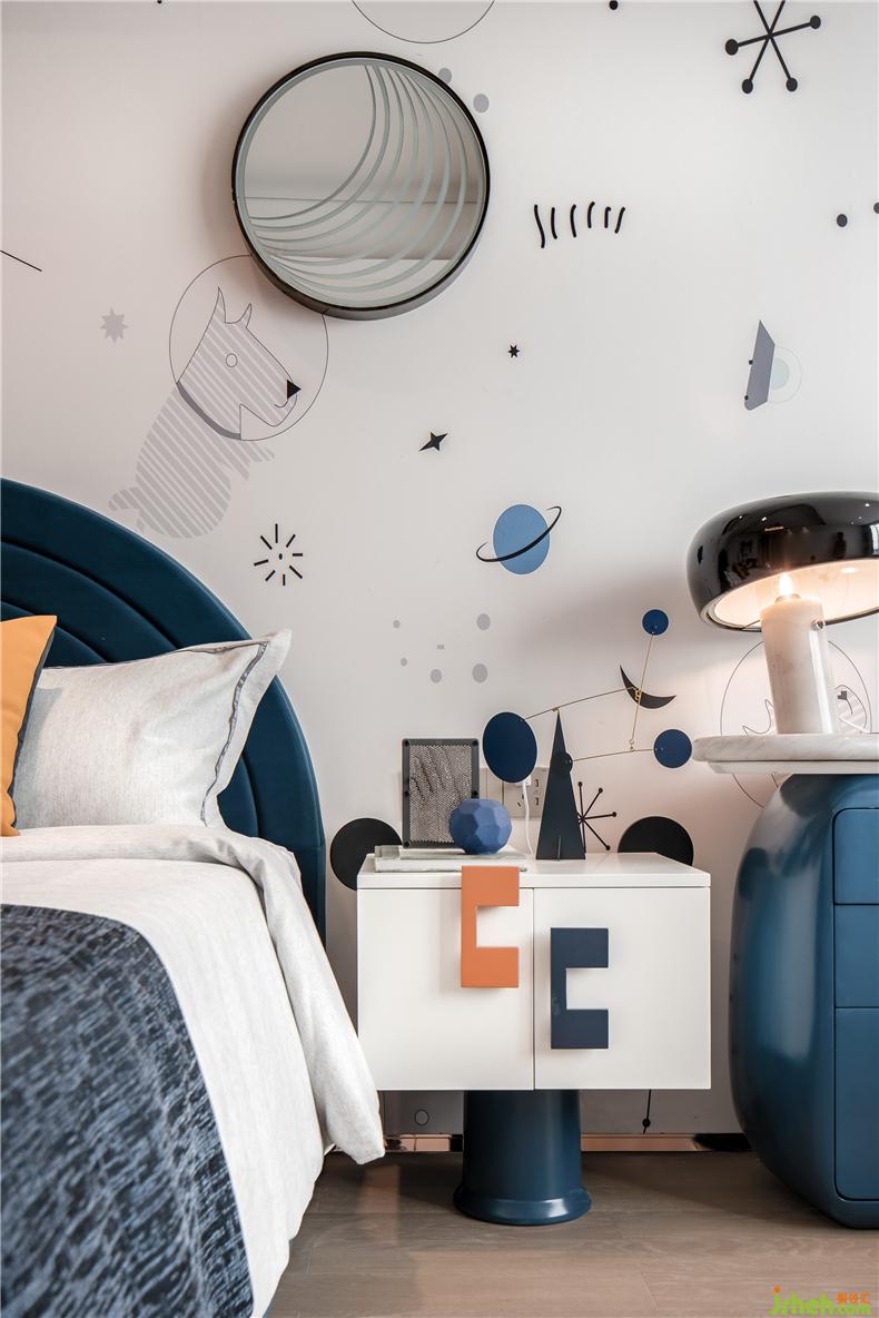 空間運用低調的煙灰藍打造別致溫馨的居住氛圍,帶著十分簡約科技圖案的墻紙與時尚飾品使簡約讓空間布局多了些許立體感