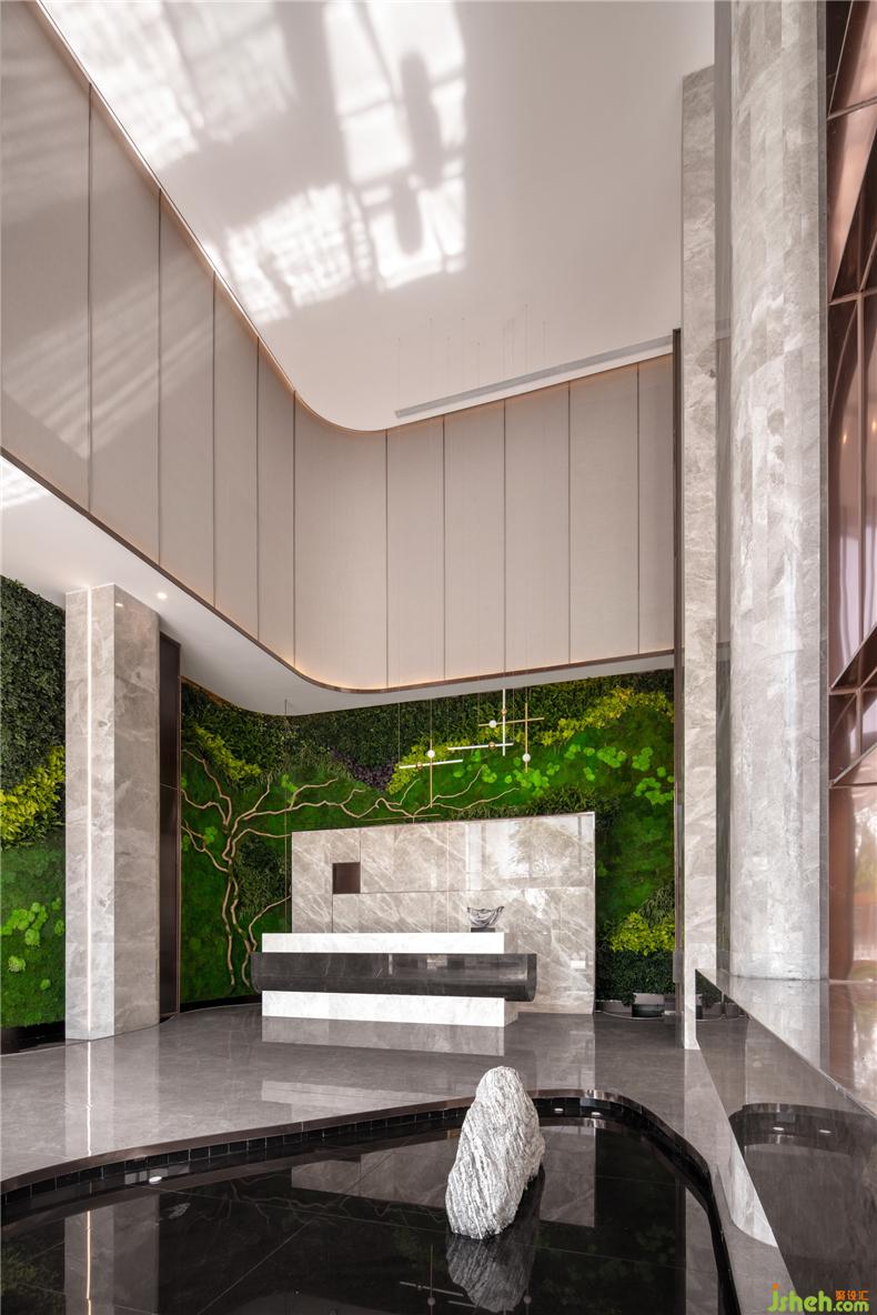 室內(nèi)水景延伸室外園林,提升建筑內(nèi)部的亮度與寬敞感,沐浴在充沛的自然光線之中;植物墻設(shè)有自動灌溉系統(tǒng),灌溉后的水通過下方水渠排出,使空間與森林融合為一體,能夠有效地增加起居舒適感,使人身心為之一暢