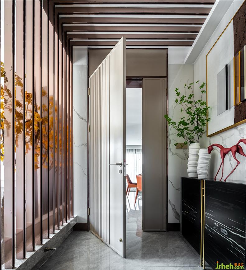 進門處的設計采用戶外玄關造景,將日常鞋具放在進門處也是一個很不錯的選擇,左手邊用格柵將茶室和室外的景觀相結合,達到半透不透的意外效果。