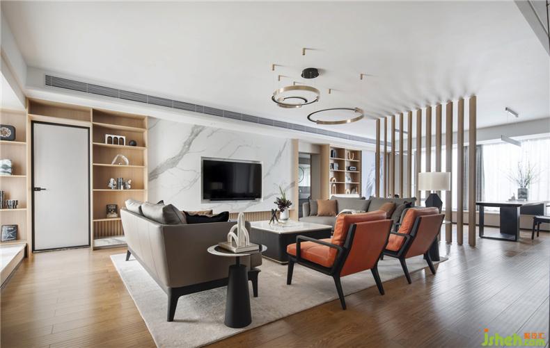 本案的整體風(fēng)格選擇了自然簡約的風(fēng)格表達(dá),私宅定制設(shè)計(jì)師注重對空間格局的重塑,在設(shè)計(jì)表達(dá)上則用最干凈利落的手法,沒有多余的裝飾,努力呈現(xiàn)生活最簡單質(zhì)樸的狀態(tài)。色彩上用清爽的高級灰裝飾,軟裝陳設(shè)用暖橙點(diǎn)綴,點(diǎn)亮了空間色彩,簡潔而不單調(diào)。