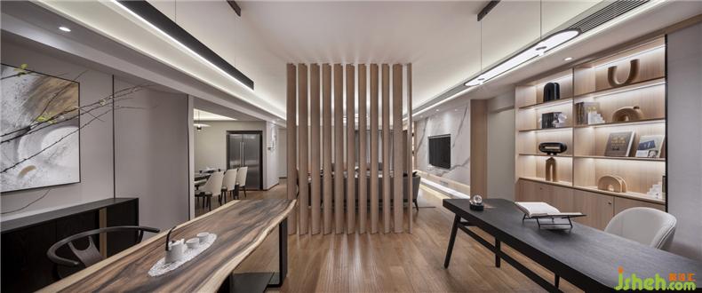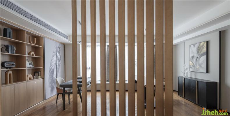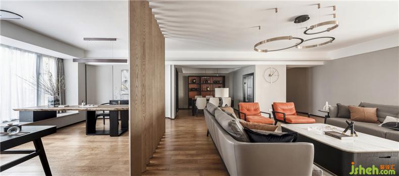 原始結(jié)構(gòu)房屋居中橫貫的一道29cm的低梁,被設(shè)計(jì)師利用做為餐廳吊頂,作為客廳、餐廳和書房區(qū)域的虛擬隔斷,一舉兩得。