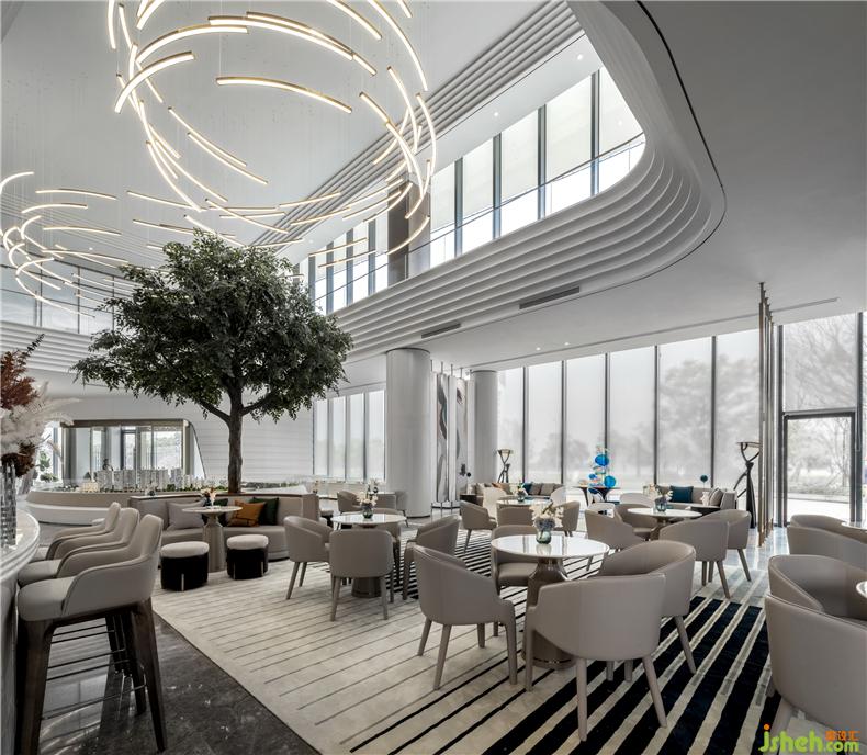 銜接一二層之間的是一盞巨大的藝術(shù)吊燈,橫貫洽談區(qū),以水波紋為設(shè)計靈感,用藝術(shù)的手法,抽象的表現(xiàn)水流形態(tài),給人留下視覺震撼。以水便以水為媒介,藉由自然光影與建材紋理, 捕捉水波的藝術(shù)姿態(tài),注入設(shè)計理念, 并將其貫穿在空間當(dāng)中,讓人留住當(dāng)?shù)氐乃洃洝?