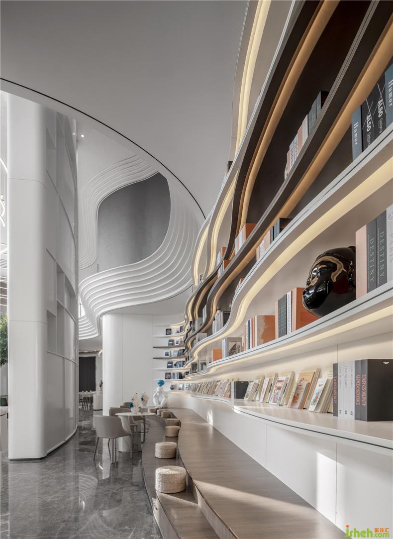 書吧的書墻采用流線型的波紋設(shè)計,層層綽約的書架讓人仿佛置身于海浪波濤之中,與整體水文化設(shè)計呼應(yīng),悠遠(yuǎn)寧靜,絢麗多彩的的設(shè)計更是為整體空間增添了一抹暖色,舒適宜人。