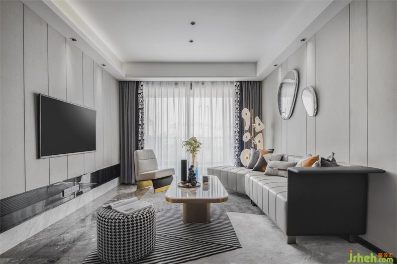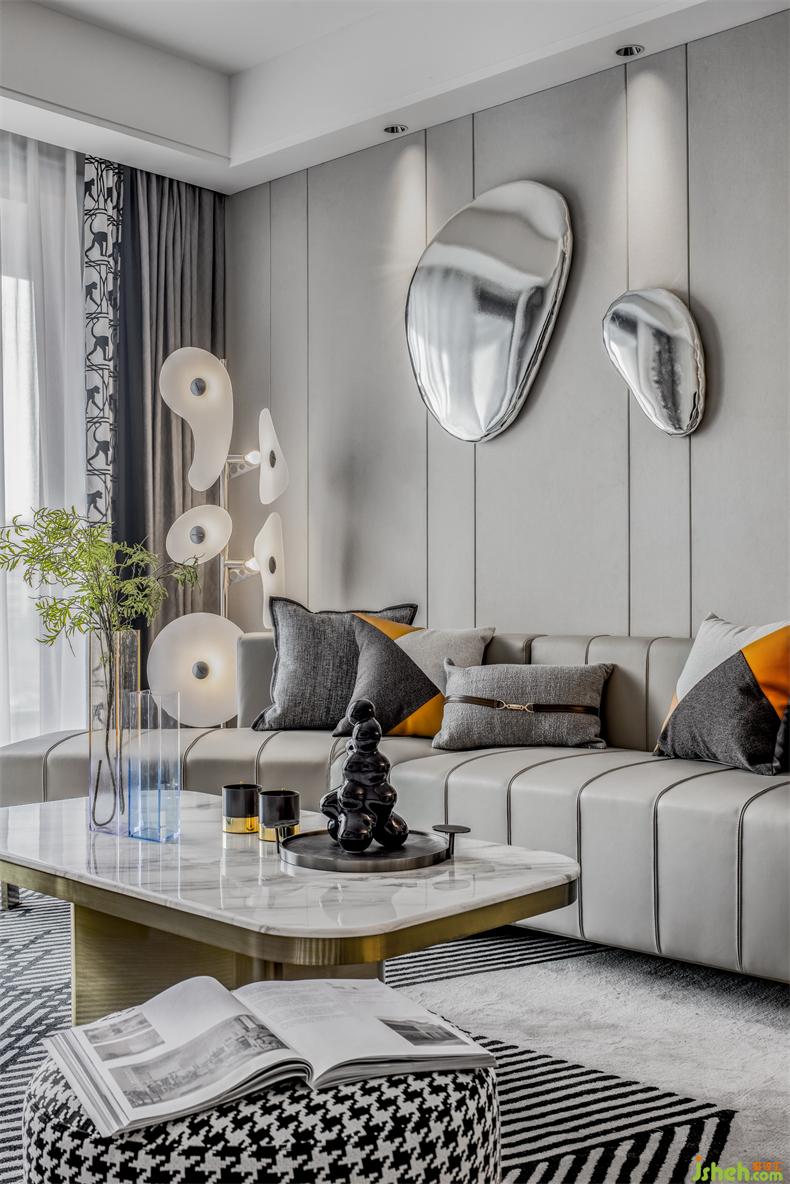 別具新意的不規(guī)則沙發(fā)設(shè)計,立體跳躍的圓形金屬裝飾掛件,樣板房設(shè)計皮革、金屬等元素和諧交織,在定義空間的同時,以摩登的立體化設(shè)計編制出空間豐富的表情