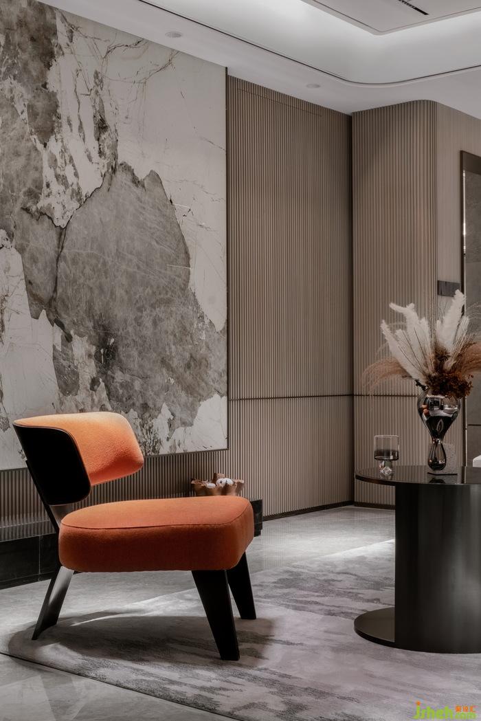 花紋別致的大理石背景墻自然生長,一抹橙色在空間綻放生機(jī),帶來濃濃的暖意。