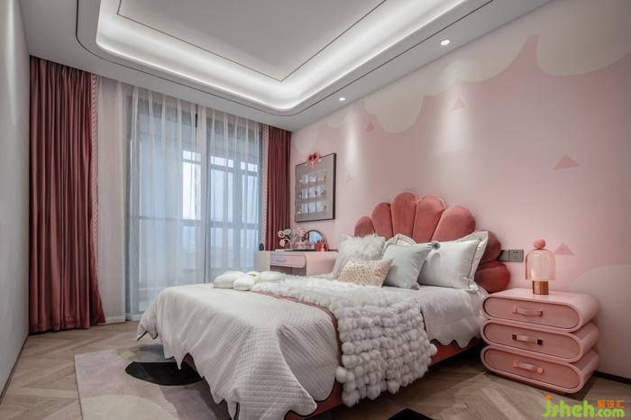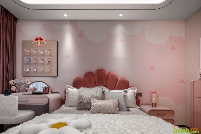 樣板房軟裝設(shè)計以粉色為空間基調(diào)的女孩房溫馨可愛,云朵狀的床頭背景墻充滿童話故事的夢幻感,定制的書桌與精心挑選的玩偶使得整個空間活潑,活力感十足。