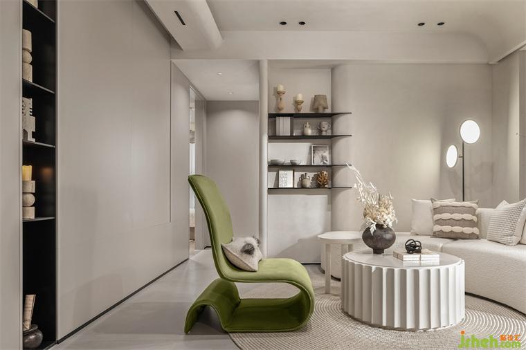 客廳空間的高級(jí)感無(wú)需靠堆砌來(lái)完成,適當(dāng)?shù)牧舭资歉唠A、靈動(dòng)的呈現(xiàn)。樣板間設(shè)計(jì)以自然家居柔美的流線搭配局部疊級(jí)形式,綠色單椅增加了視覺(jué)上的中心性,保留侘寂空間的大氣簡(jiǎn)潔又不失質(zhì)感的美學(xué)格調(diào)。
