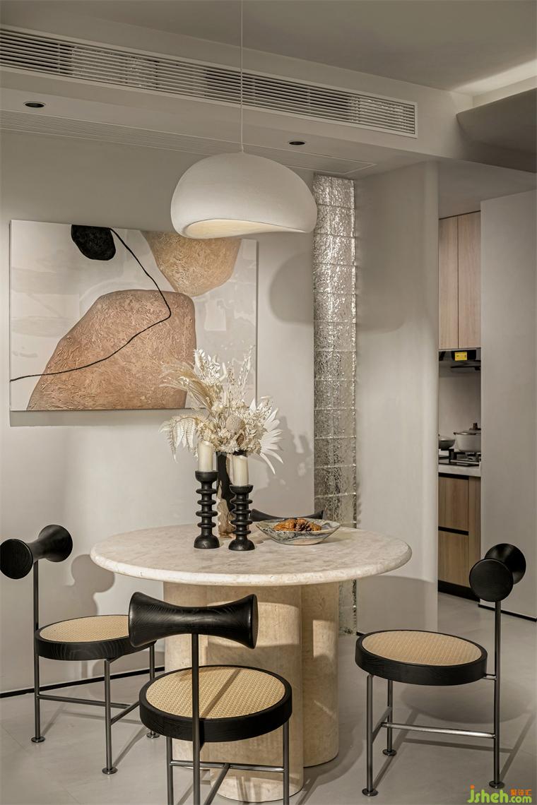 暖色系的餐桌,高級(jí)感滿滿,桌腿流暢的線條與平整的桌面形成鮮明的對(duì)比,樣板房設(shè)計(jì)以純粹營造浪漫的藝術(shù)氛圍,幾何與豐潤,不同形態(tài)的「圓」遙相呼應(yīng),形成嚴(yán)謹(jǐn)安靜的色彩及藝術(shù)感受