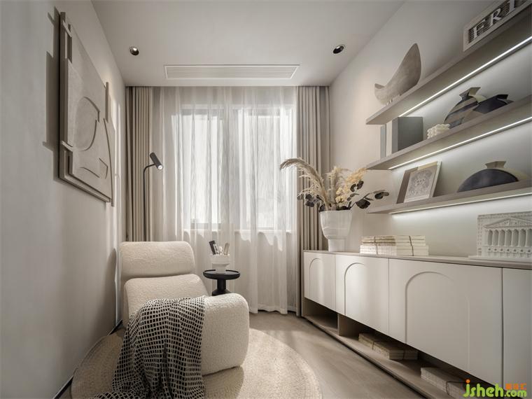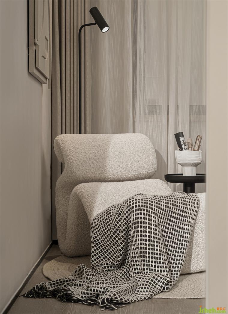 奶白色單人沙發(fā)溫馨柔軟,顆粒絨材質(zhì)顯得溫暖又舒適,在這里,亦或是閱讀、沉浸、冥想,仍由時(shí)間游走,使書房的空間成為心靈洗滌之所。