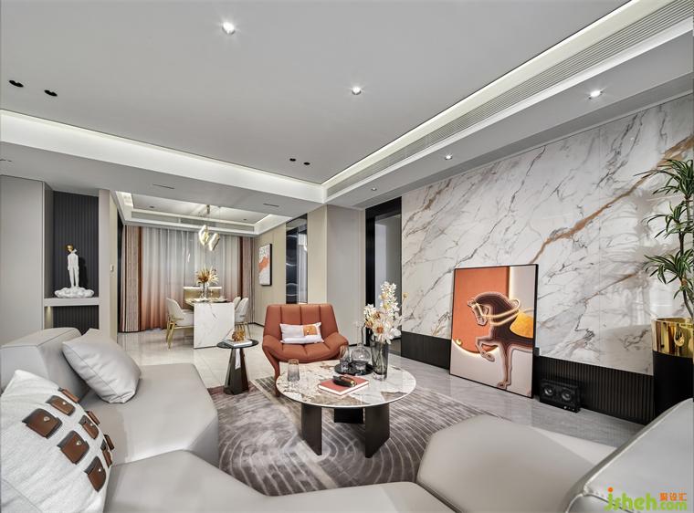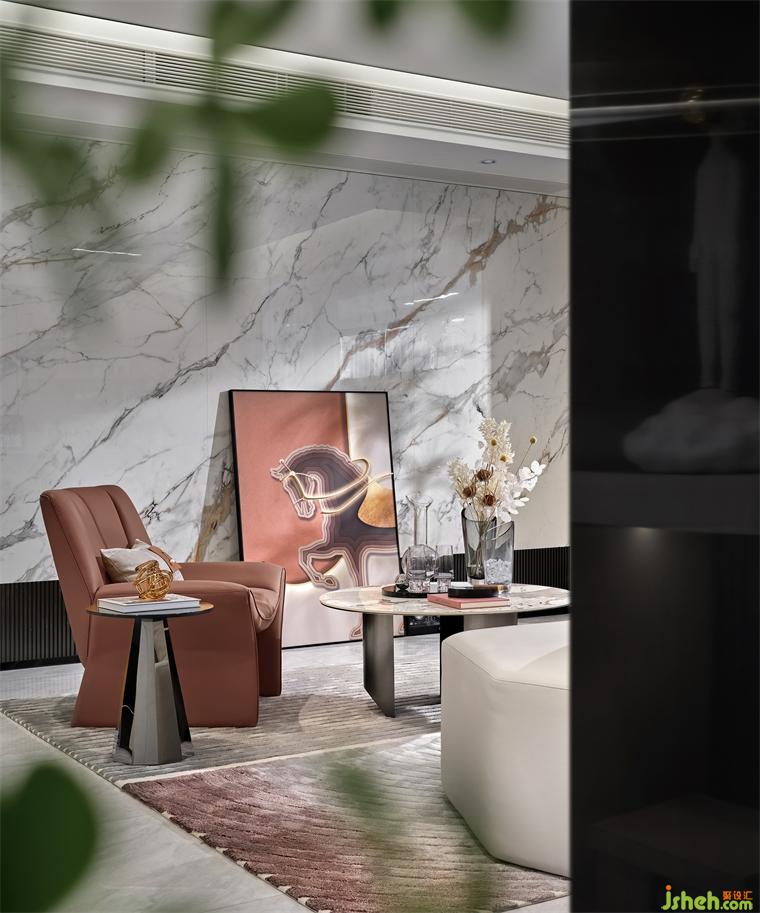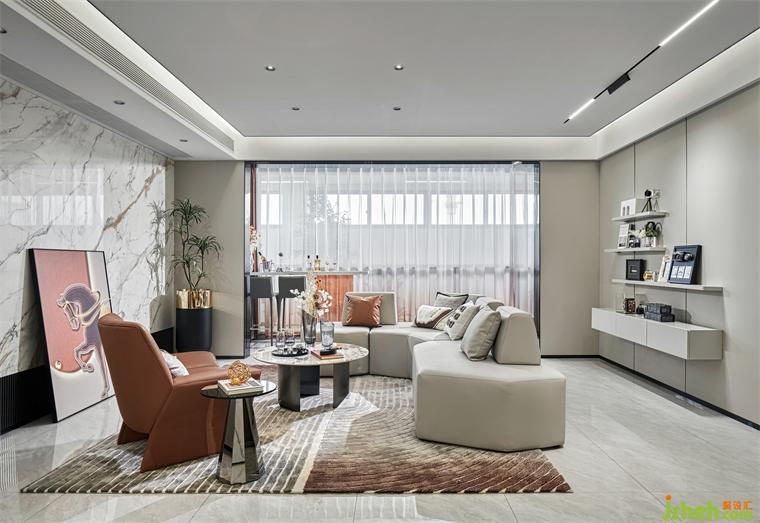 橙色在空間里自然溫暖親切,漸變色的地毯及窗簾為軟裝背景,樣板房設(shè)計結(jié)合客廳空間卡拉拉金巖板、皮革、金屬、玻璃等,將空間的質(zhì)感與舒適度再次融合提升,還原出一個近乎原生態(tài)的心靈棲所,自由流動。