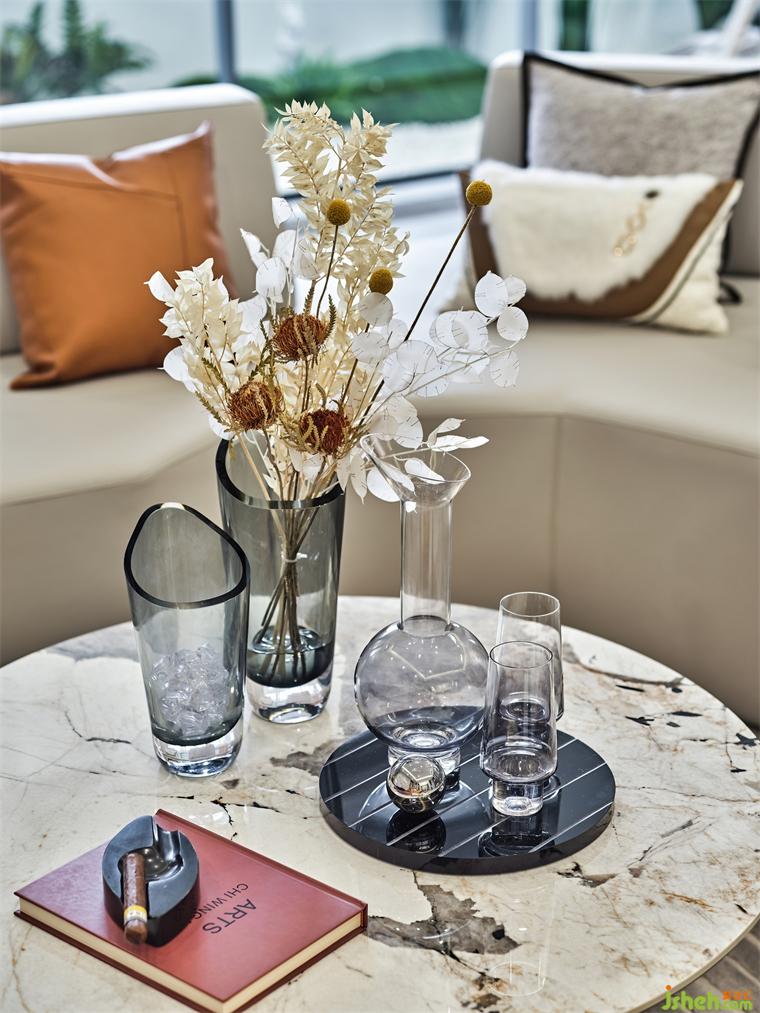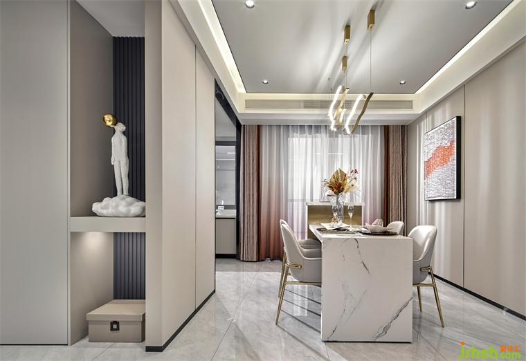 餐廳區(qū)域延續(xù)了客廳的色彩搭配,注重美與藝術(shù)呈現(xiàn)方式,樣板房設(shè)計大理石桌面、精美的花瓶與酒杯共同烘托熠熠生輝的怡人氣氛,展現(xiàn)溫馨雅致的生活情境。在材質(zhì)的紋理、區(qū)域的交界、線面的分割、燈光的溫度和家具顏色的變化上,都可見設(shè)計師的巧妙用心。