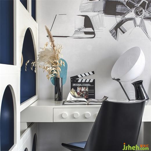 男孩房以快節(jié)奏的賽車(chē)主題,且為慢場(chǎng)景的藝術(shù)演繹而著相立形,一灰一藍(lán),在軟飾中升華趣志。