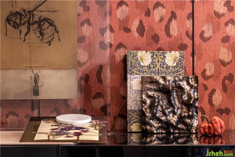 床頭采用大面積的暗紅色蝶影波點(diǎn)Eijffinger墻紙,來自歐洲的百年品牌Hague,以用色大膽、設(shè)計(jì)創(chuàng)新著稱。家具的暗紋亦是以蝶變?yōu)橐庀?,與墻紙呼應(yīng)。