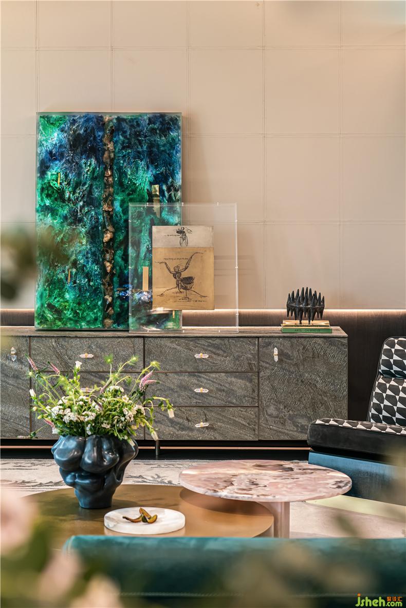 搭配客廳復(fù)古綠色的基調(diào),電視柜臺(tái)上亦放有一幅綠色印象藝術(shù)作品,與地板、墻壁和家具的色彩中碰撞出復(fù)古的現(xiàn)代時(shí)尚感。藝術(shù)家畫作取義雨澤碧草,利用立體構(gòu)成、色調(diào)間的自然變化與對比色的互補(bǔ)形成強(qiáng)烈反差,即冷靜深沉,又熱情奔放,如現(xiàn)實(shí)與夢境的融合與對照。