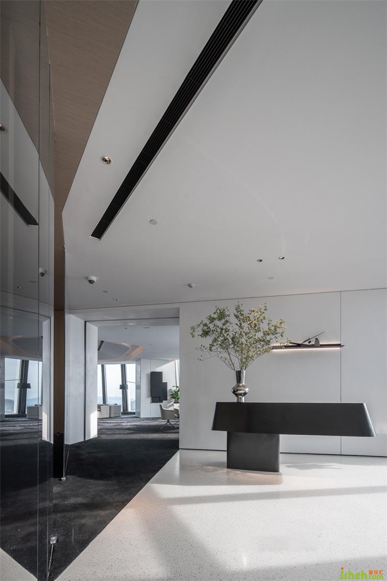 總裁辦公室前特別設(shè)有接待臺,黑色木飾面搭配石材質(zhì)地內(nèi)臺,辦公室設(shè)計黑色金屬材質(zhì)桌腳,三種材質(zhì)組合而成,造型獨特醒目,與入口處的灰色石材接待臺互為呼應(yīng),成為兩個不同空間的連接點。黑色接待臺的功能,為總裁打造了一個相對安靜和專屬的空間,未經(jīng)預(yù)約和許可不得入內(nèi)。