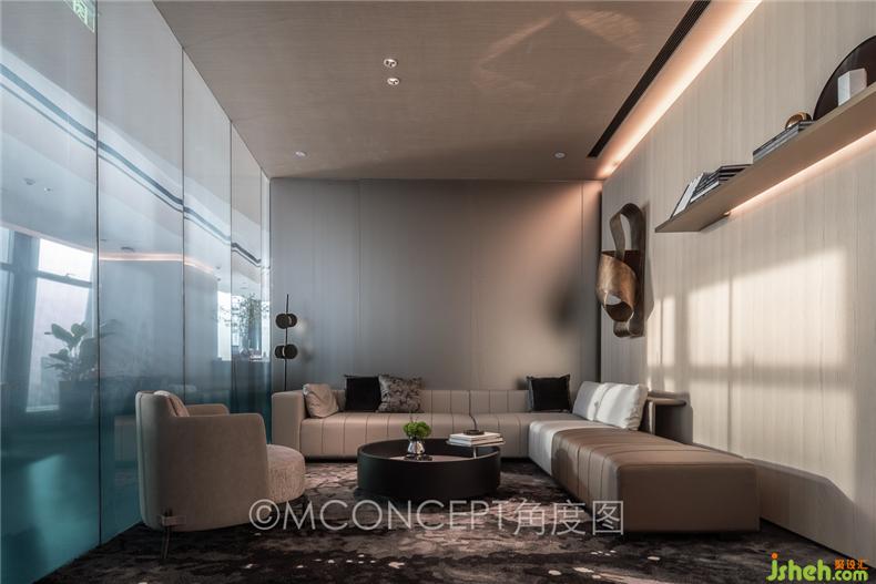 VIP接待室,摒棄了厚實的墻面,采用漸變色玻璃營造通透空間氛圍,辦公室設(shè)計既保障洽談的私密性,又為封閉空間帶來自然采光。黑灰色紋理地毯與米色系家具搭配,帶來舒適與奢雅的氛圍。