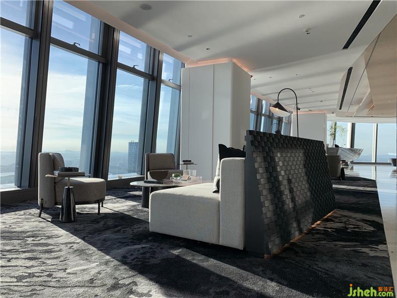 沙發(fā)分組擺放,形成小氛圍洽談空間,家具的選擇與配色簡約典雅,辦公室設(shè)計呈現(xiàn)穩(wěn)重寧靜之感。營造舒適感之外,設(shè)計師亦考究細節(jié),為空間添加亮點。如黑灰色地毯藏有金絲細線,隨光線變化,泛起金沙點點;沙發(fā)背部設(shè)有馬賽克屏風(fēng)靠背,黑色木刻凹凸格紋質(zhì)地,營造半私密間隔氛圍,增加洽談儀式感。