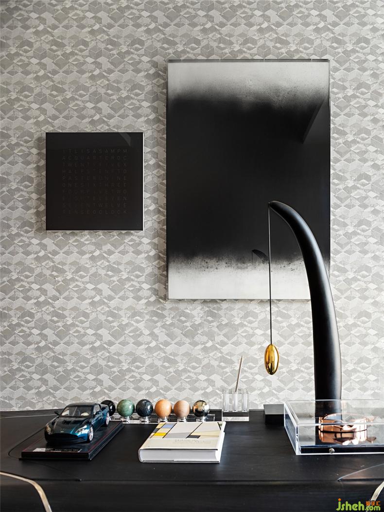 書房延續(xù)整體設(shè)計(jì)理念,以動(dòng)感的流線型書桌與辦公椅定下空間基調(diào),結(jié)合模擬光的前沿藝術(shù)裝飾畫和Qlocktwo創(chuàng)意時(shí)鐘,科技感與未來感并存。