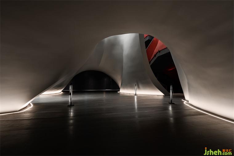 The cavernous entrance is conceived as a time tunnel, evoking the iconic information flow scenes from the classic sci-fi film2001: A Space Odyssey. On the dark, smooth surface, the reflection of the red neon curve breaks, scattering into points, and creating a blurred and ambiguous ambiance.