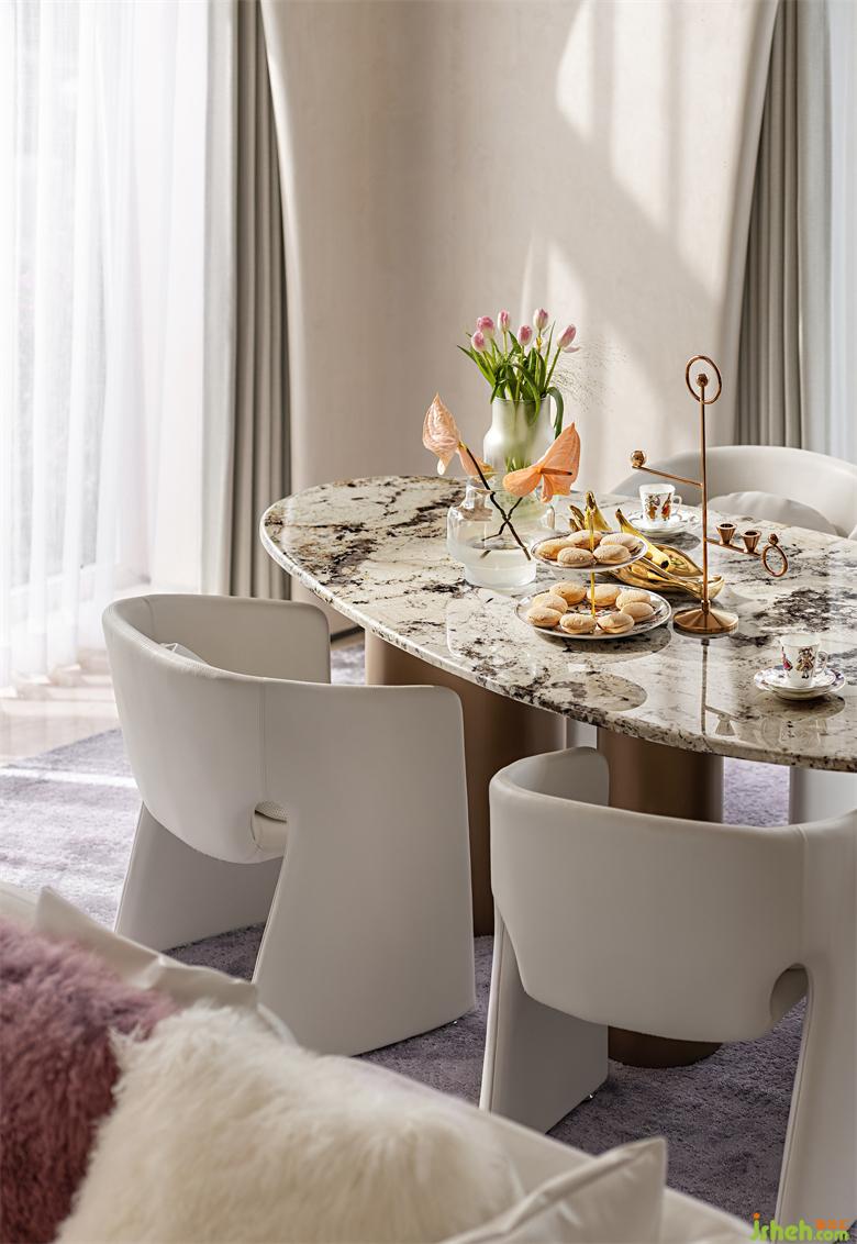 弧線感的家具與建筑呼應(yīng)成一體,木槿紫地毯巧妙的打破了空間沉悶感,在優(yōu)雅格調(diào)的另一面,把印象帶回《千與千尋》的紫暮晚霞。