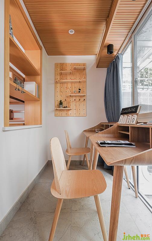 ▲書(shū)房是整個(gè)家里采光和通風(fēng)效果最好的一個(gè)區(qū)域,也是原有陽(yáng)臺(tái)基礎(chǔ)上包含進(jìn)來(lái)的空間,在功能上滿足閱讀、儲(chǔ)物、書(shū)籍、裝飾等綜合作用,而在效果上也更加貼近原木色系,以后兩位寶寶可以再這里完成他們的學(xué)業(yè),陪伴共同成長(zhǎng)。