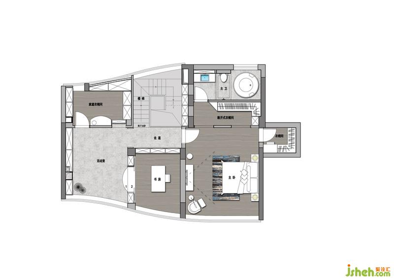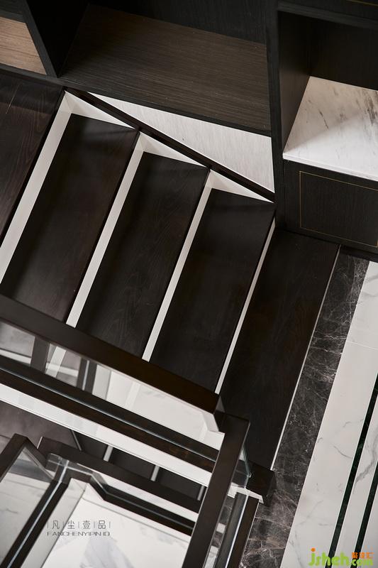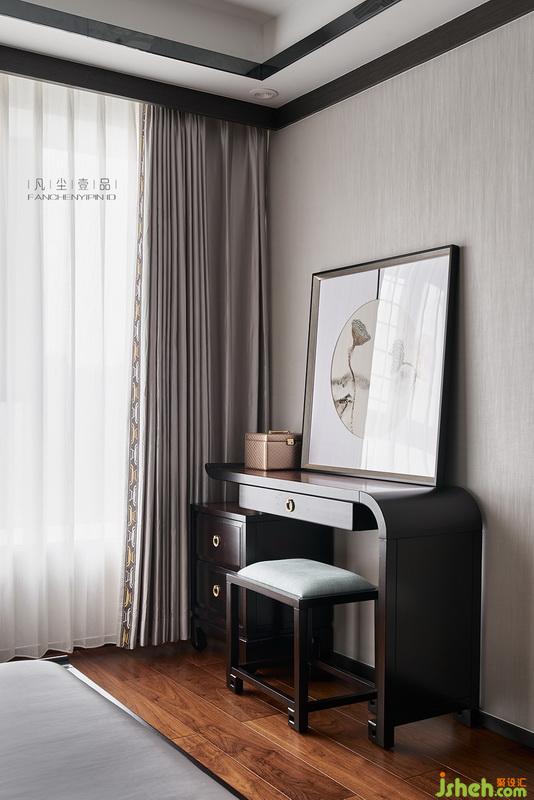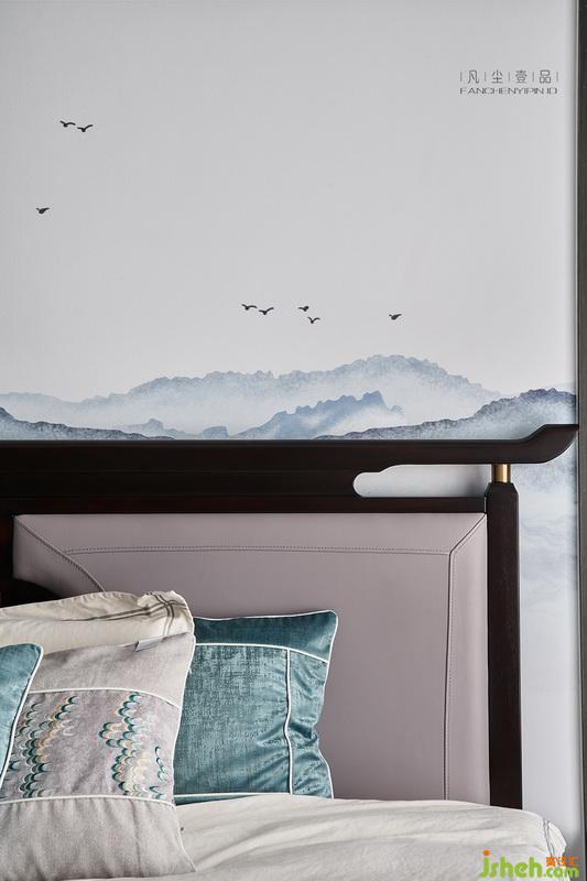 臥室的淺色調(diào)搭配家具莫蘭迪色系的軟包,墻壁為定制古韻壁畫,地板為天然黑胡桃木、豐富的色彩插入點(diǎn)綴了煙灰的空間,細(xì)膩處從容儒雅。