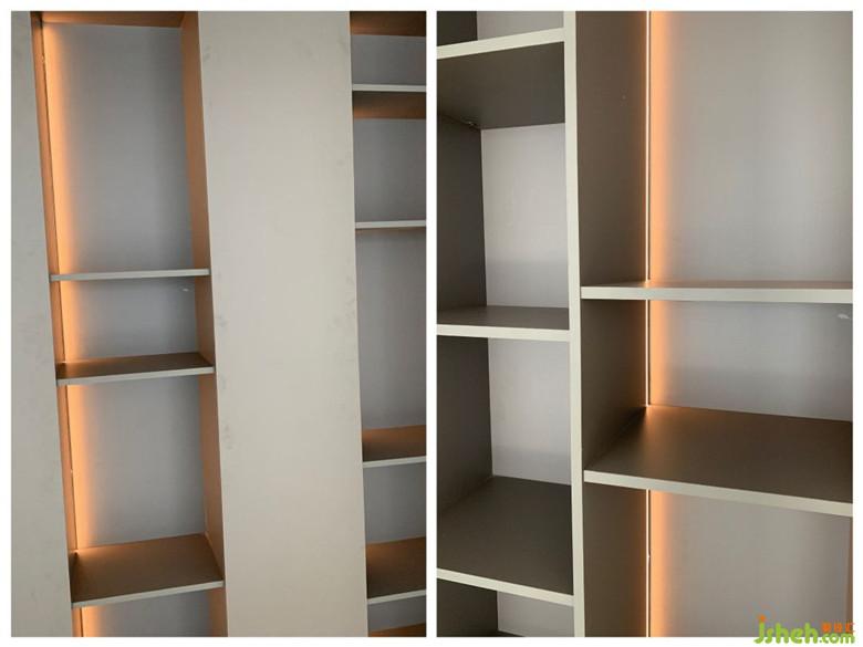 主臥衣帽間,層高≈2700mm,設(shè)計了整面到頂?shù)囊鹿?,為了保證如此高度的門片不變形,采用了一體式鋁合金邊框拉手柜門,而上下各預留了0.5cm-1cm的空間間隙,