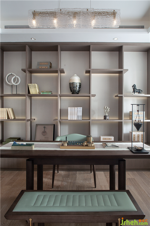 書房里原木的樸質(zhì)拉近人與空間的距離,樣板房設(shè)計書香之氣在空間里漫溢,令人回味悠長。規(guī)整秩序的書架、疏朗自然的空間韻律,將真實(shí)世界與精神世界隔離開來,在營營役役的現(xiàn)實(shí)之外擁有一處清朗、文藝的心靈居所。