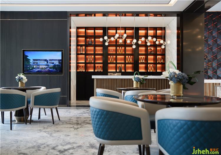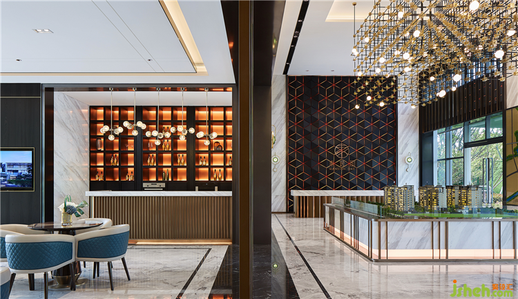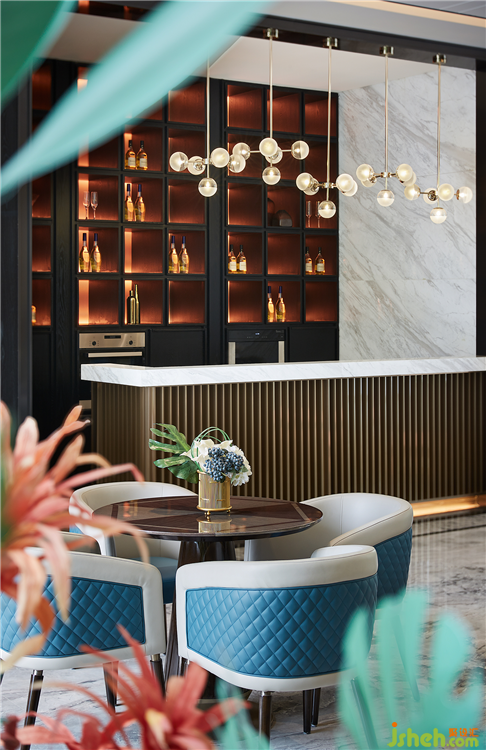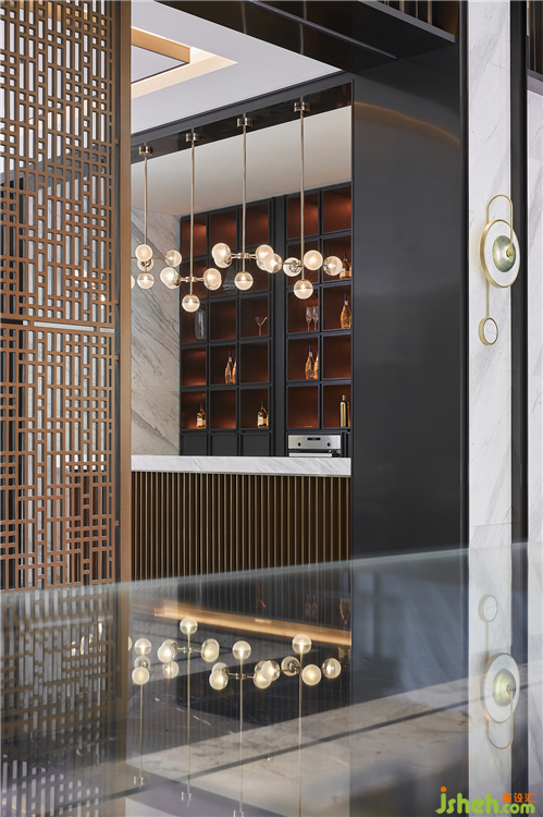 用自由與變化去呼應(yīng)水的靈動(dòng)氣韻,而Art Deco的精神性則被交托于“融合與對(duì)比”:大理石與黃銅,黑鋼與黑色木飾面,現(xiàn)代冷傲與復(fù)古精致兩種截然不同的材質(zhì)搭配、對(duì)比,展現(xiàn)一種包容性極強(qiáng)的融合之美。