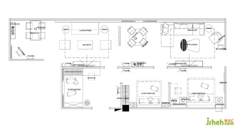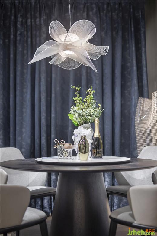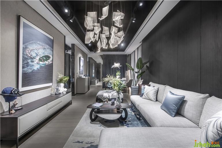所有的家居都來自設計師精心的設計,定制出各式不同的圖案,展廳設計將海洋元素巧妙地運用到電視背景墻、掛畫、地毯、窗簾布藝之中。用漸變的藍色,掌握了色彩的藝術,將家居物件靠枕、單椅進行點綴,時刻凸顯海洋氣息;提取海面波光粼粼的元素作為地毯的圖案,吊燈的形狀提取了海洋生物的特征;看似簡單的茶幾,其實設計師在細節(jié)上做了“手腳”,桌腿是透明的玻璃,搭配波光粼粼的地毯,像是若有似無的浮在海面上。