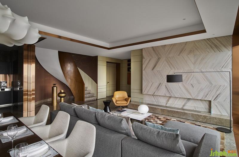 室內(nèi)通過石材、金屬、皮革等材質(zhì)的融合與對比,形成風(fēng)韻現(xiàn)代與優(yōu)雅古典的對話,渲染出國際大都會的俊朗風(fēng)度??蛷d以對紋理手法打造背景墻,豐富視覺觀感;壁爐升騰,暖意回升。窗外,精致璀璨的都市圖景盡收眼底,坐臥之間,遠(yuǎn)觀近袛,皆融入城市的熱流。